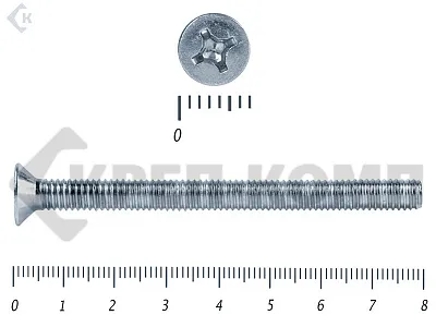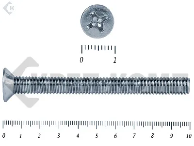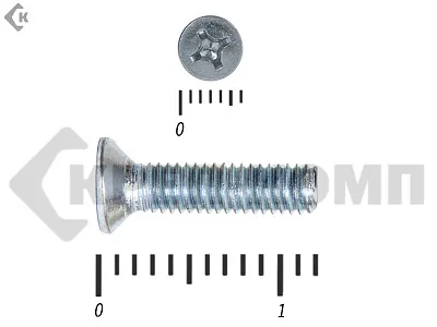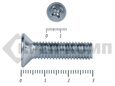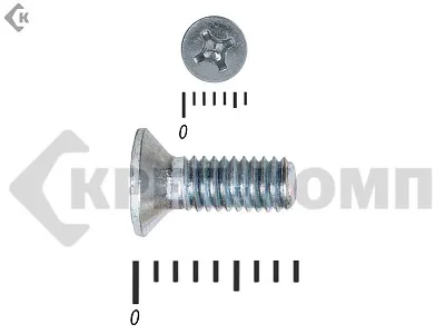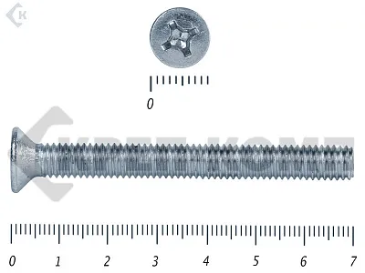 Винт с потайной головкой DIN 965, (ГОСТ 17475), оцинкованный, класс прочности 5.8. Шляпка при монтаже глубоко утапливается в материале и не выпирает наружу. Винт DIN 965 с потайной головкой с крестообразным шлицем и полной резьбой (метрической стандартного шага, нарезанной по всей длине шпильки). Винты DIN 965 используются в строительстве, машиностроении, промышленных и производственных отраслях совместно с шайбами, гайками соответствующих размеров
