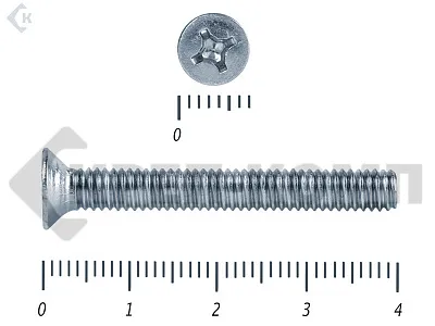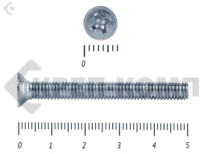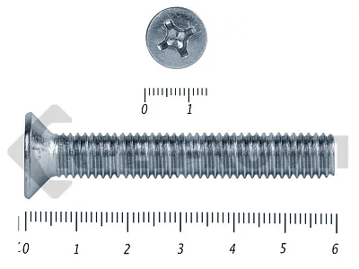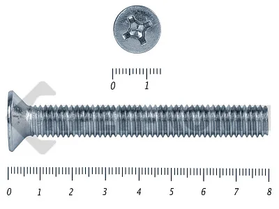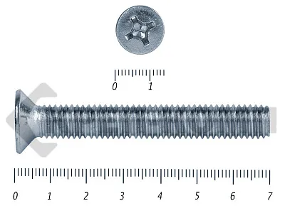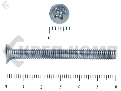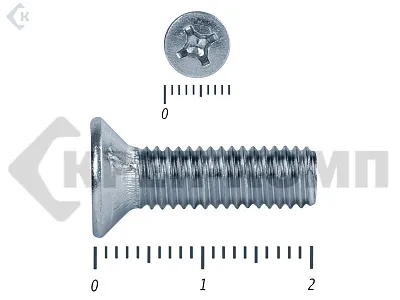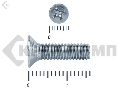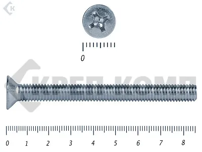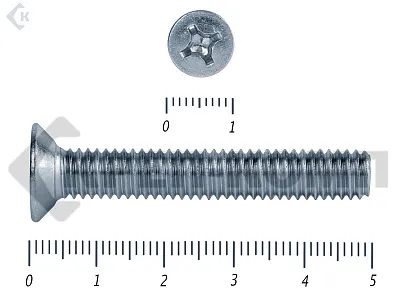 Винт с потайной головкой DIN 965, (ГОСТ 17475), оцинкованный, класс прочности 5.8. Шляпка при монтаже глубоко утапливается в материале и не выпирает наружу. Винт DIN 965 с потайной головкой с крестообразным шлицем и полной резьбой (метрической стандартного шага, нарезанной по всей длине шпильки). Винты DIN 965 используются в строительстве, машиностроении, промышленных и производственных отраслях совместно с шайбами, гайками соответствующих размеров